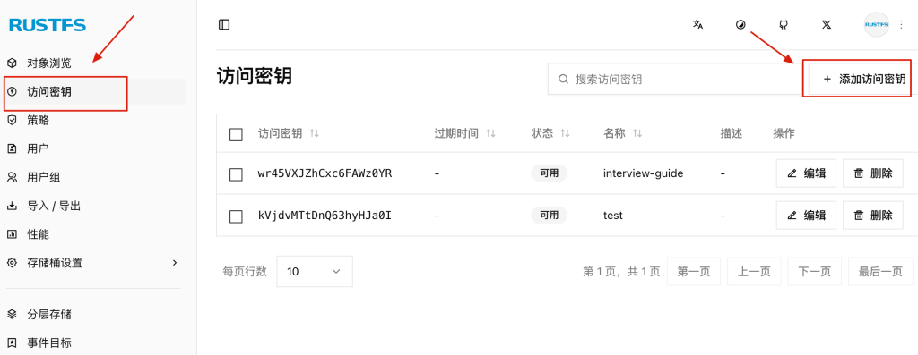 #access-key和secret-key需要在RustFS的后台管理进行生成